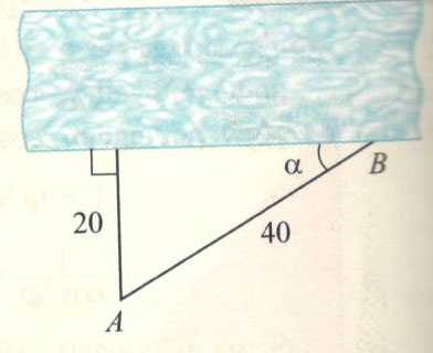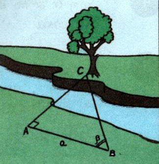 ვთქვათ, მდინარის ნაპირიდან 20 მეტრის მანძილზე - A წერტილში ვიმყოფებით და ვმოძრაობთ მდინარისკენ - ნაპირის B წერტილისკენ, AB=40მ. იპოვეთ კუთხე ჩვენი მოძრაობის მიმართულებისა და მდინარის ნაპირს შორის (a კუთხე).სურათის მიხედვით მართკუთხა სამკუთხედის ორი გვერდი ვიცით, ვპოულობთ კუთხეს.