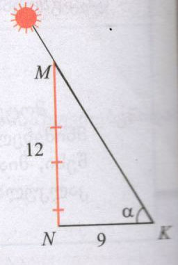 12 მეტრიანი MN ანძის NK ჩრდილის სიგრძე 9 მეტრია. ვიპოვოთ კუთხე KM ნახევარწრფისა (KM სხივს) და ჰორიზონტს (KN-ს) შორის.ცხადია, Tga=12/9=4/3